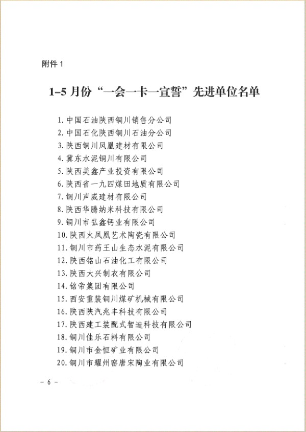 此次公司榮獲銅川市1-5月份“一會(huì)一卡一宣誓”先進(jìn)單位,公司員工吳進(jìn)軍榮獲“一會(huì)一卡一宣誓”先進(jìn)個(gè)人稱號(hào),是對(duì)公司安全生產(chǎn)工作的充分肯定,也是公司全體職工弘揚(yáng)奮進(jìn)精神、矢志艱苦創(chuàng)業(yè)的一個(gè)縮影,公司全體職工將繼續(xù)立足崗位、埋頭苦干,為公司持續(xù)快速發(fā)展和集團(tuán)高質(zhì)量發(fā)展貢獻(xiàn)力量。