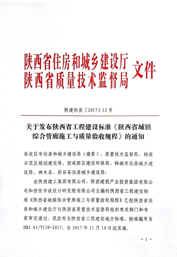 近日,由陜建投資集團(tuán)主編的《陜西省城鎮(zhèn)綜合管廊施工與質(zhì)量驗(yàn)收規(guī)程》經(jīng)陜西省住房和城鄉(xiāng)建設(shè)廳與陜西省質(zhì)量技術(shù)監(jiān)督局批準(zhǔn)發(fā)布,標(biāo)準(zhǔn)編號(hào)為DBJ 61/T139-2017,自2017年11月10日起實(shí)施。這是陜建投資集團(tuán)在編寫工程建設(shè)地方標(biāo)準(zhǔn)方面取得的一項(xiàng)重要科研成果,充分顯示了集團(tuán)在城鎮(zhèn)綜合管廊領(lǐng)域的綜合技術(shù)實(shí)力。